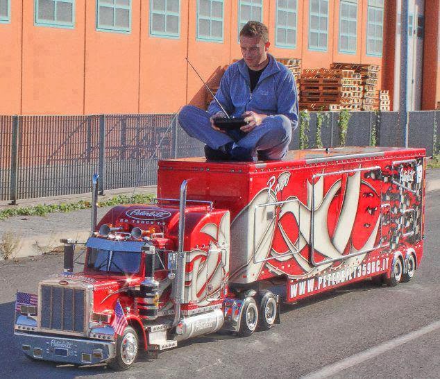 Bordin but it over 2,000 hours of work, over nine months, but the result is just breathtaking. His remote-controlled Peterbilt 359 model is a perfect replica of the original, right down to the authentic California license plates. The 16-foot-long, 3-foot-tall model tips the scale at 180 kg without the trailer, and goes over 250 kg with the trailer attached. He used images and drawings of the American truck, built a perfectly scaled wooden model of the cabin, which he later used to make one out of fiberglass, created a sturdy iron-pipe frame capable of withstanding serious weight, and used a steering system inspired by go-karts, where the wheels have a different turning radius.
